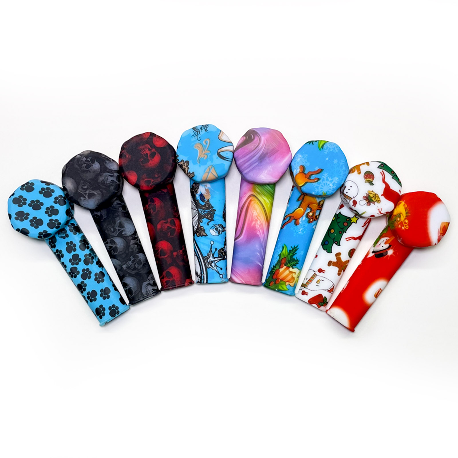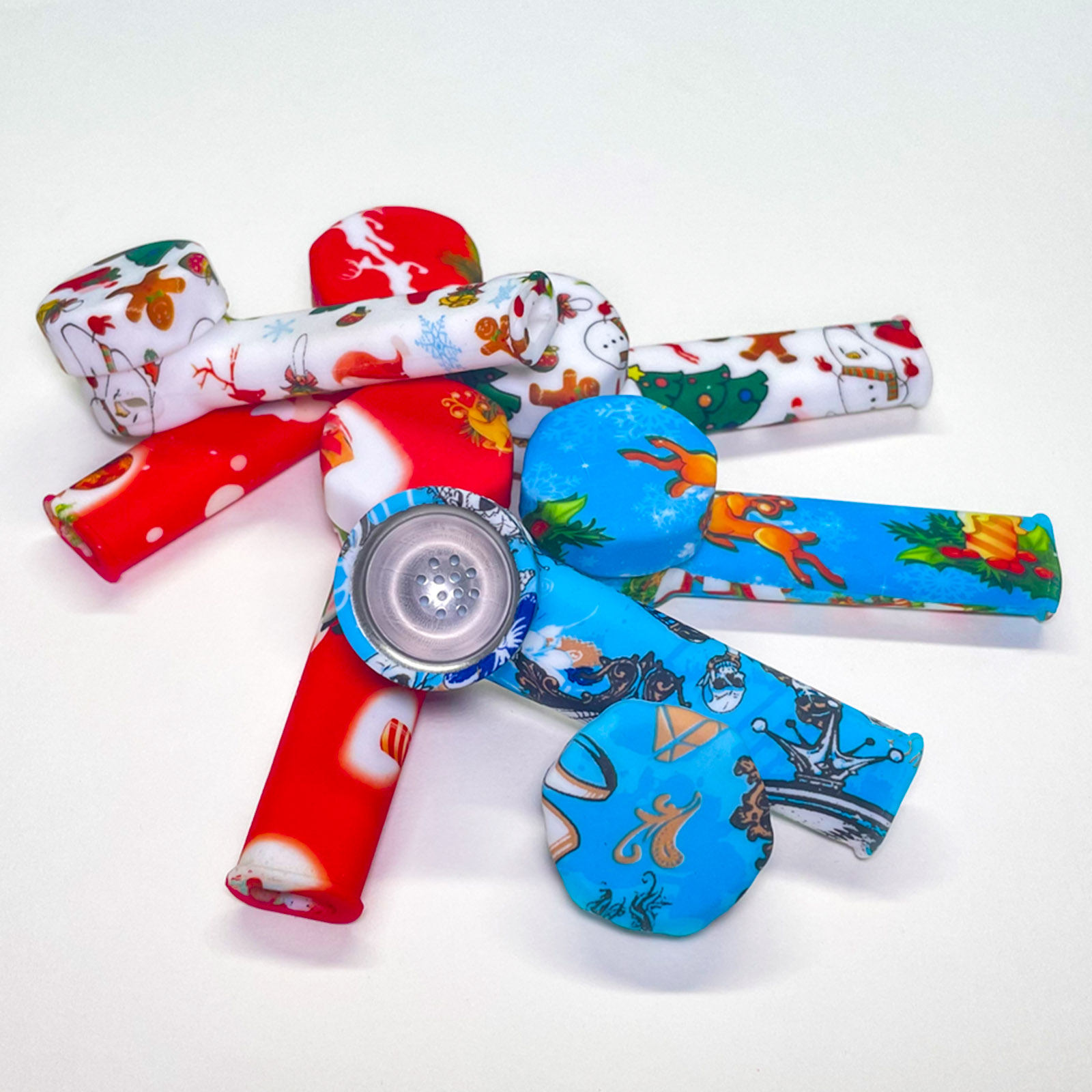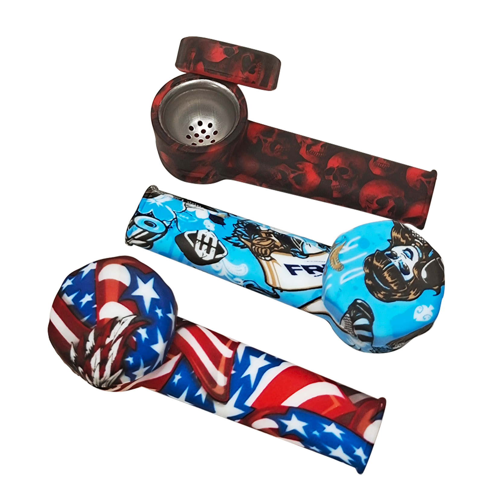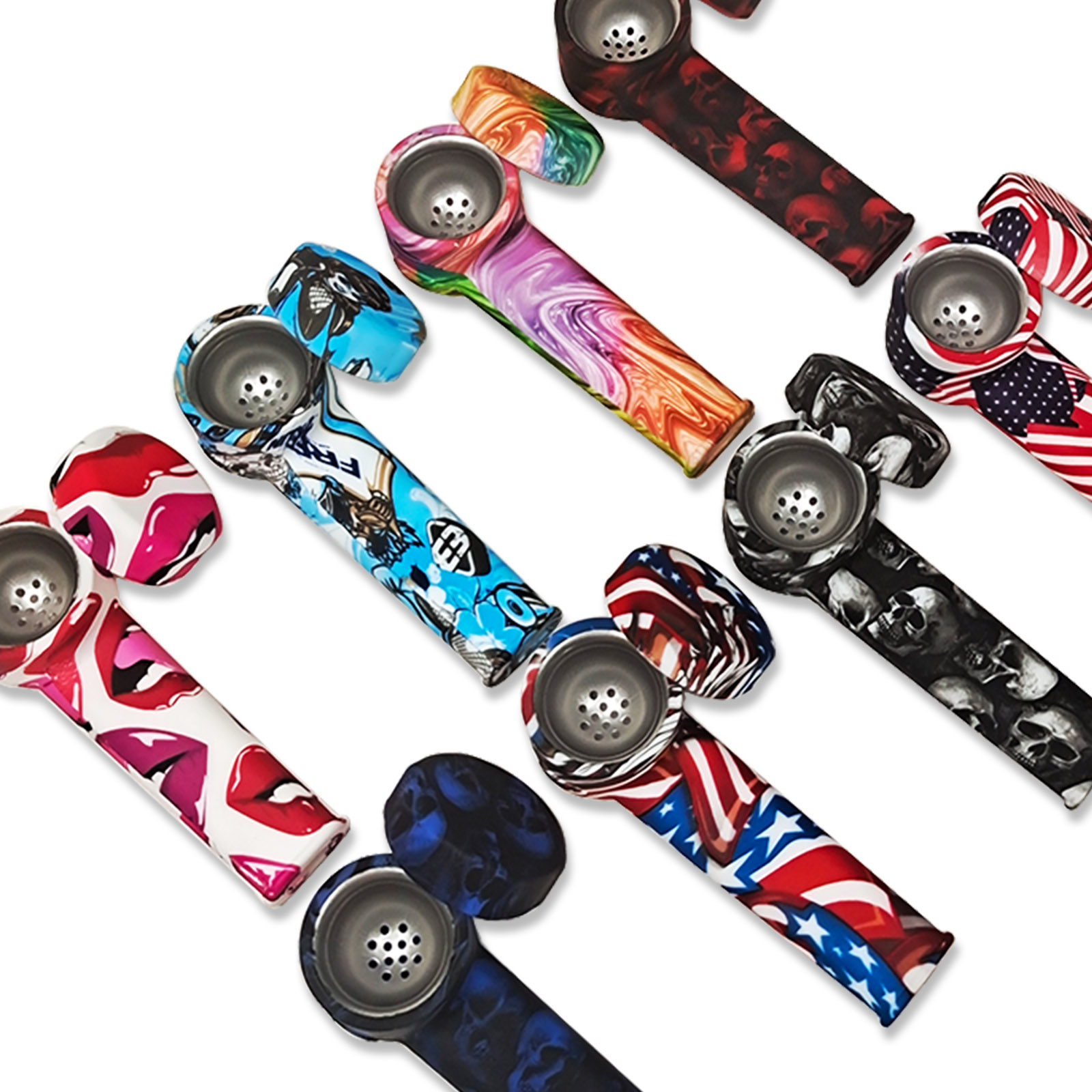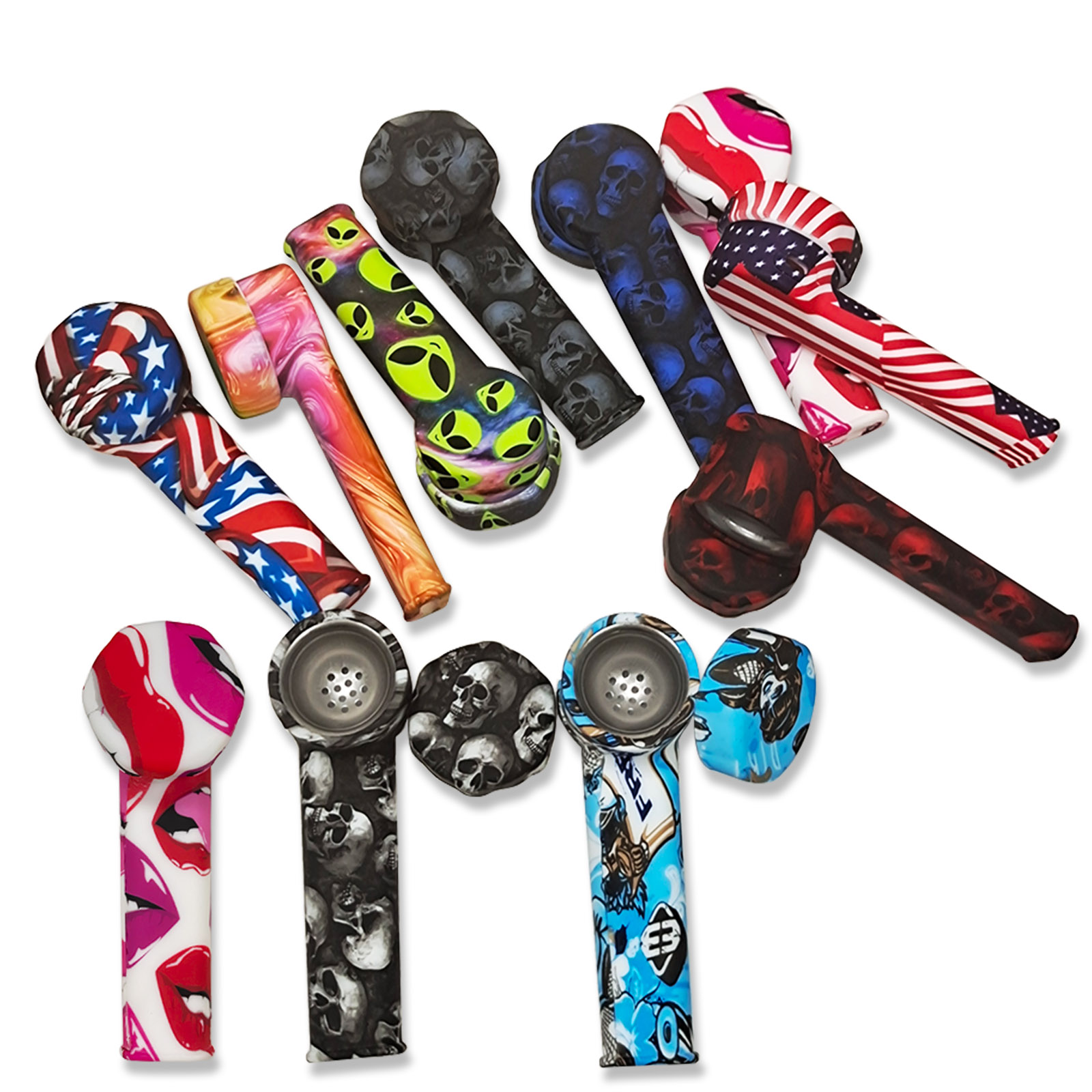 This silicone pipe features an L-shaped curved tube design, a round bowl top, a slender mouthpiece, and comes with various patterns. The smooth and glossy silicone material makes it detachable, lightweight, durable, and super easy to clean.