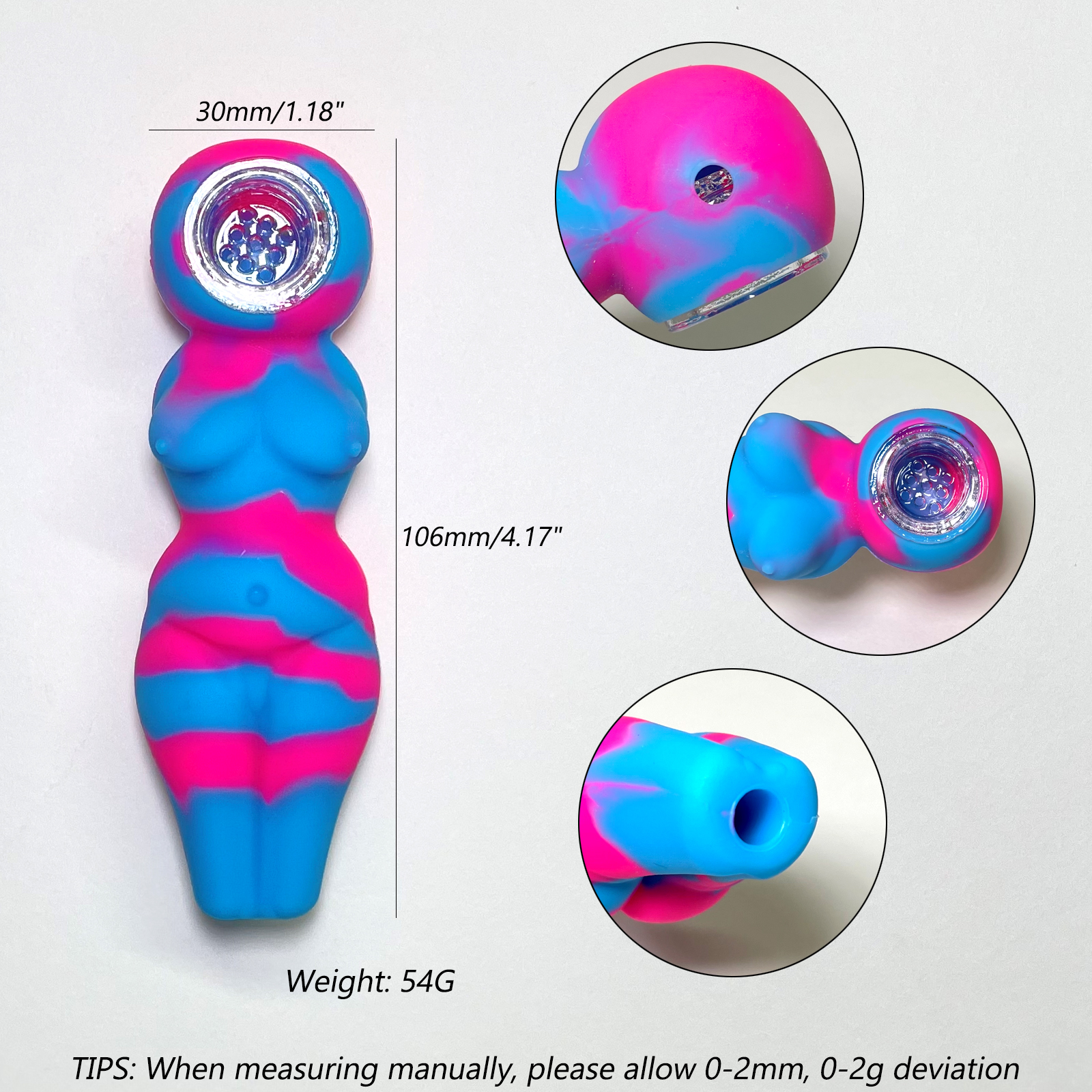 Size: Diameter: 30mm (1.18inch) Width: 28mm (1.1inch) Height: 106mm (4.17inch) Color: as shown Material: silicone + glass