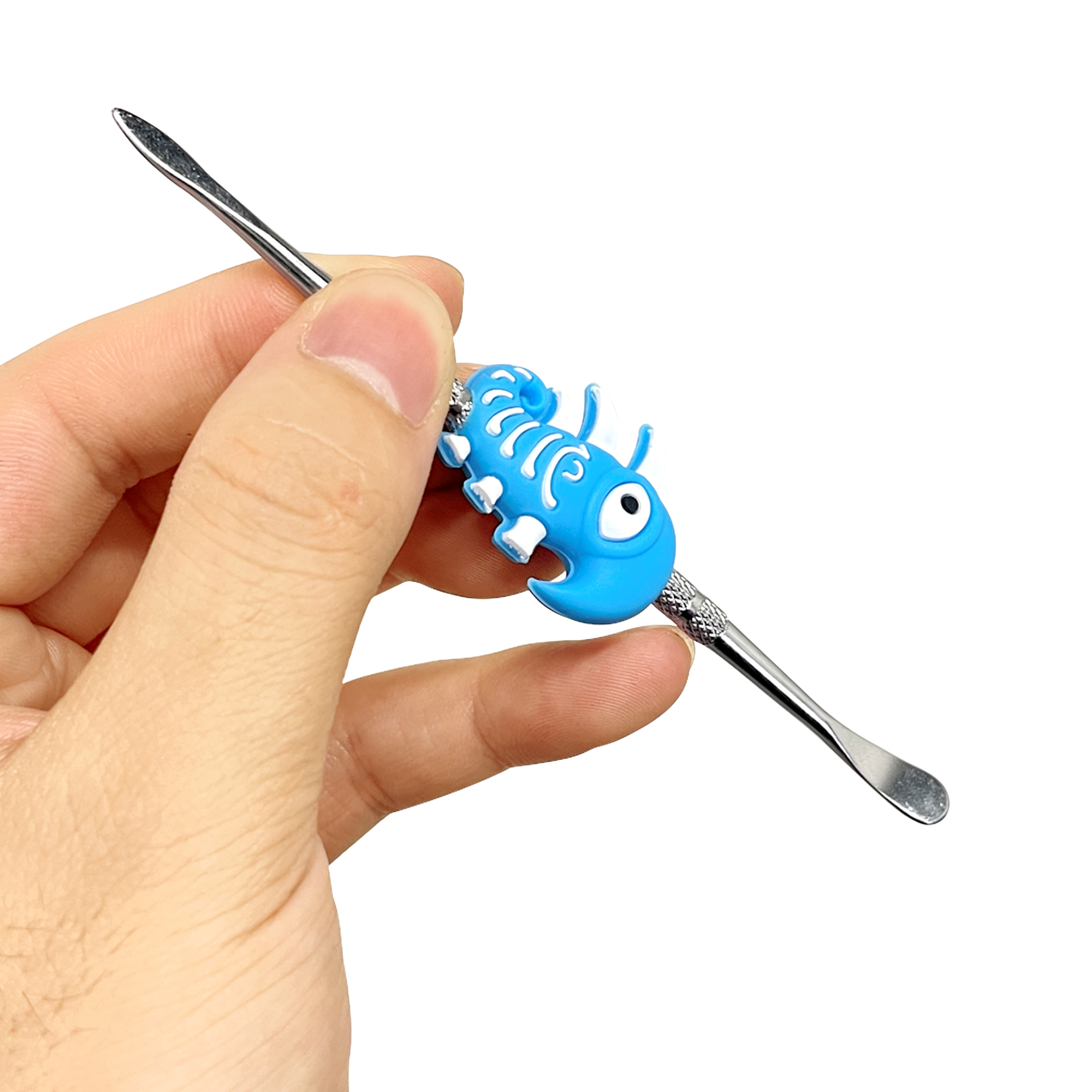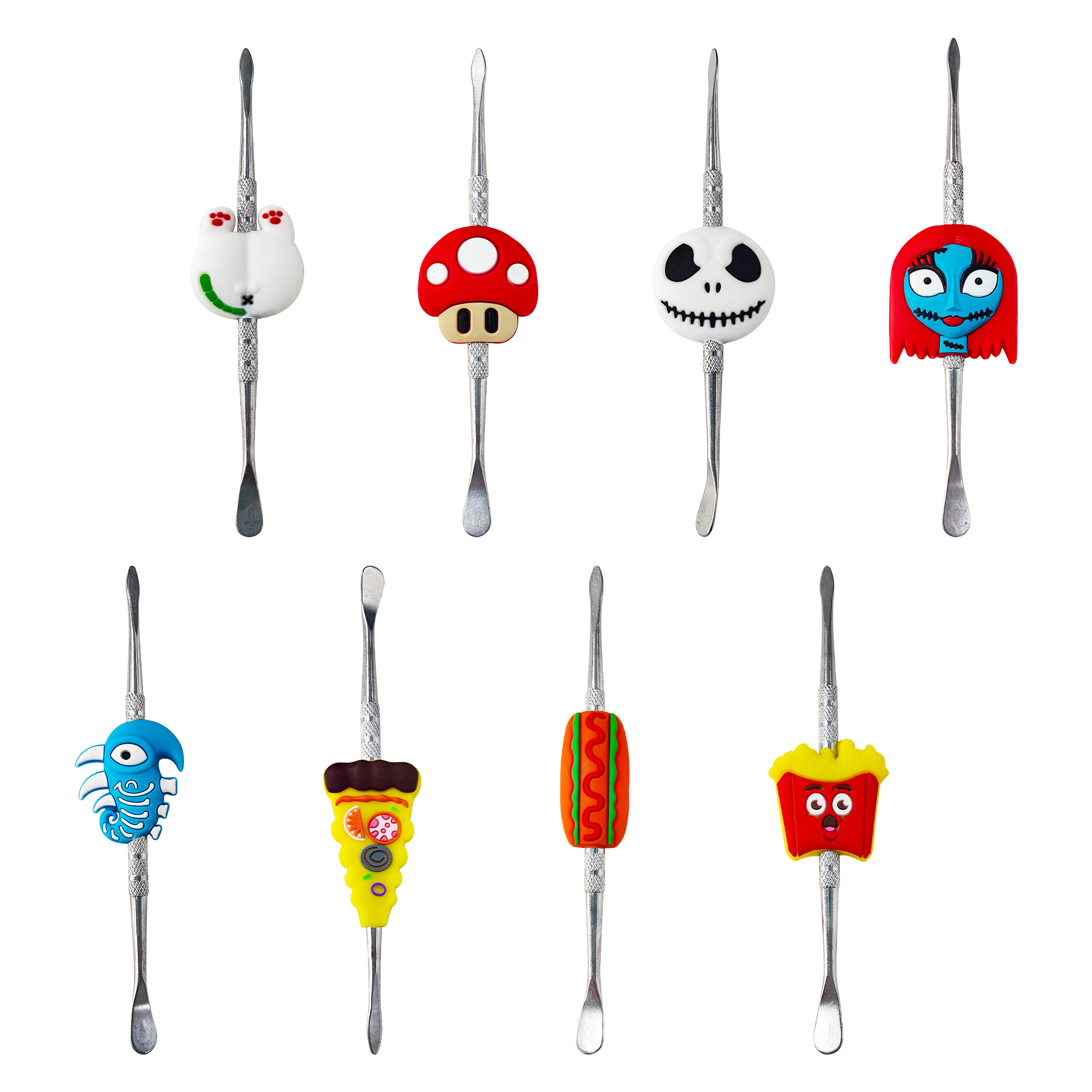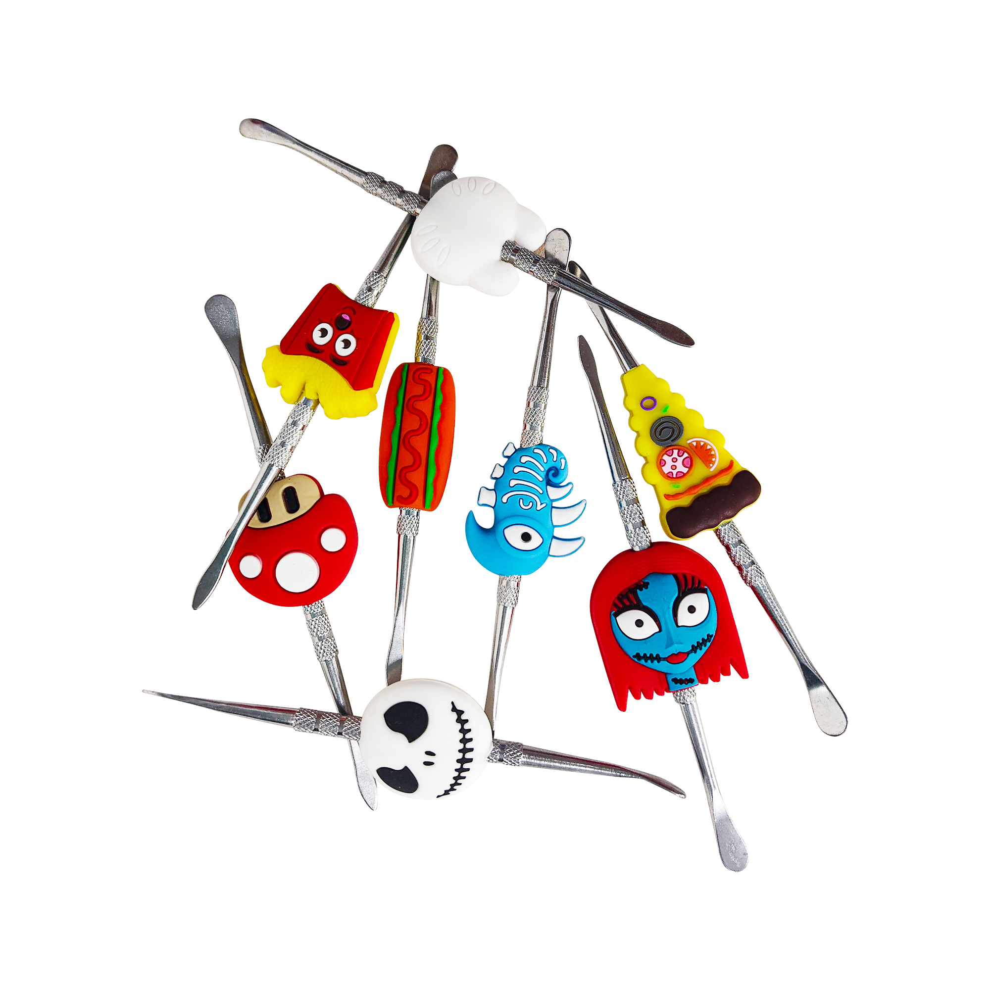 Double-headed small metal cleaning tool, each with colorful silicone cartoon decorations on the handle. The overall style is cute and vibrant, featuring a silver metallic tool body and bright, detailed decorative parts.
