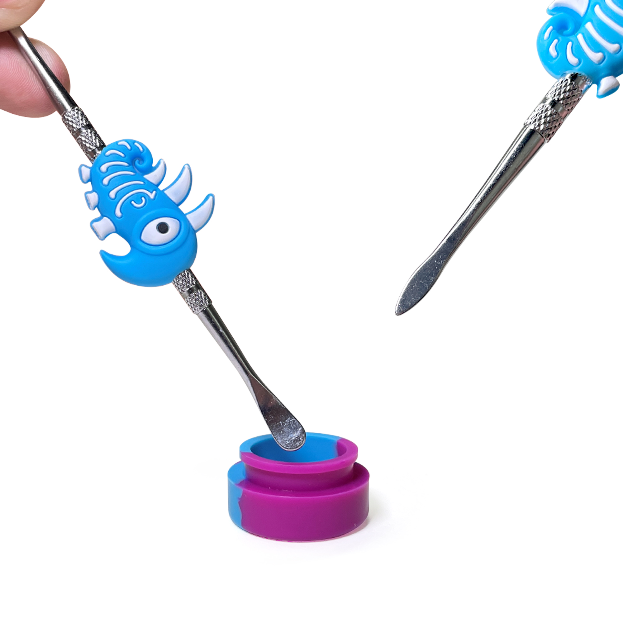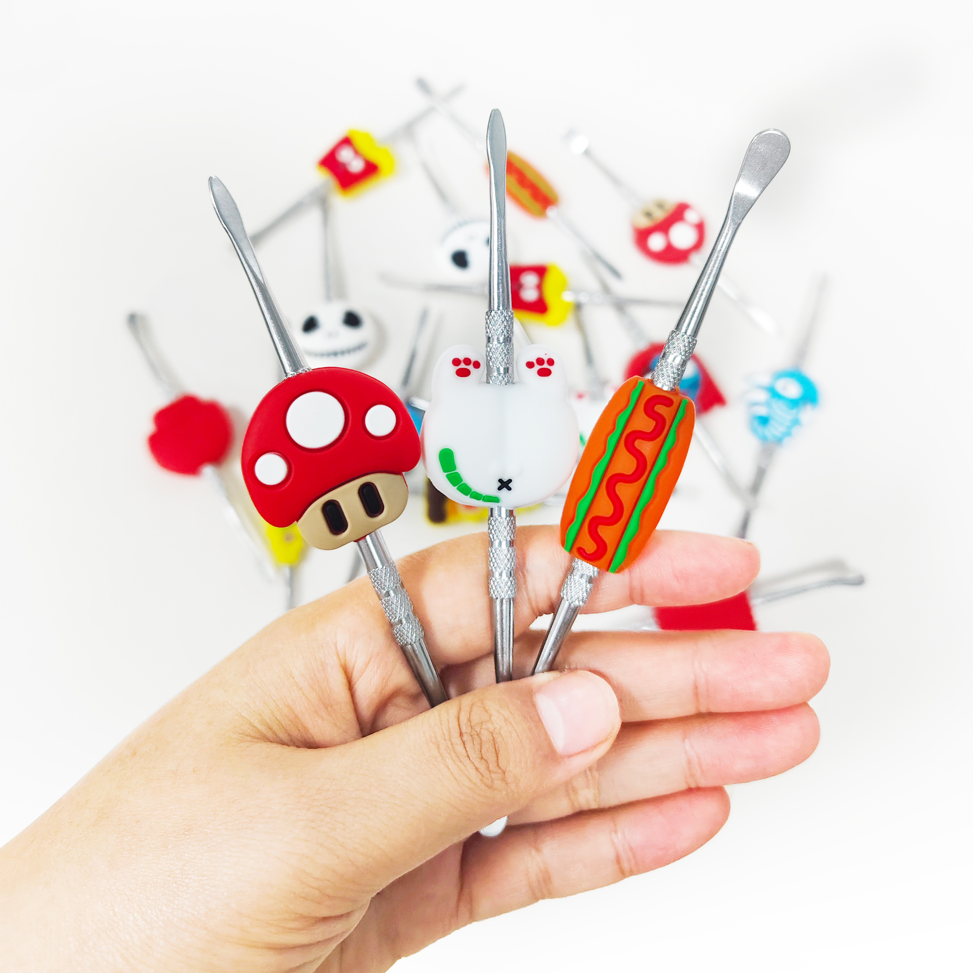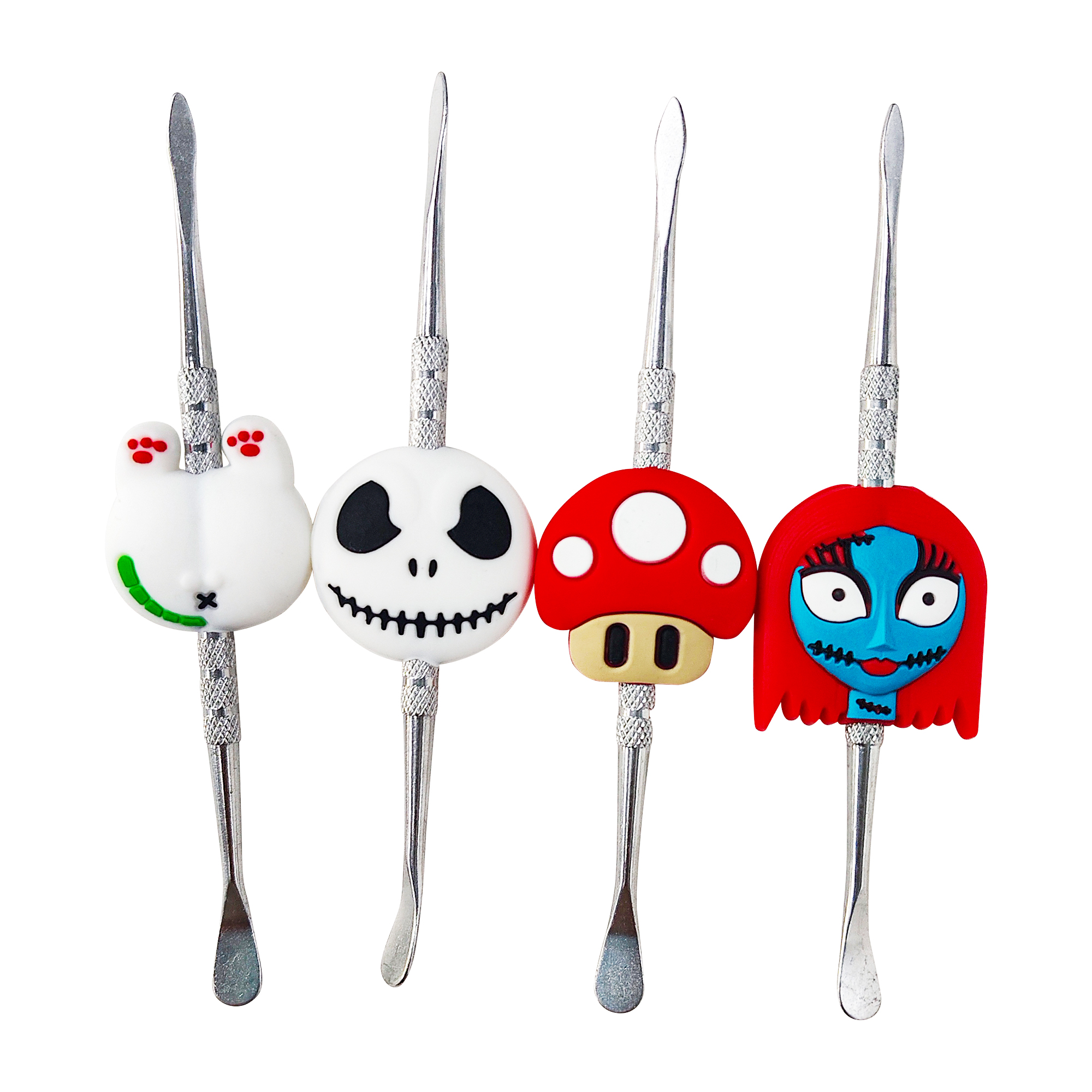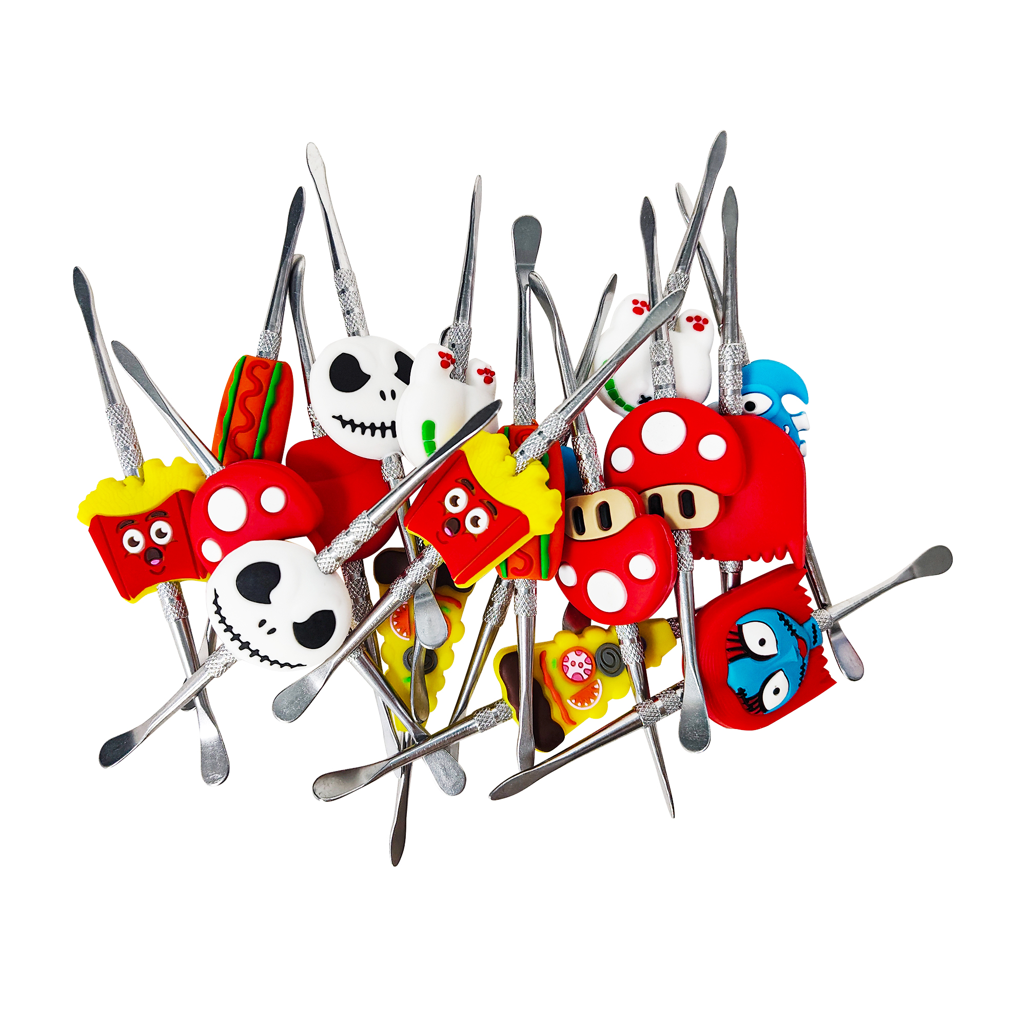 Double-headed small metal cleaning tool, each with colorful silicone cartoon decorations on the handle. The overall style is cute and vibrant, featuring a silver metallic tool body and bright, detailed decorative parts.