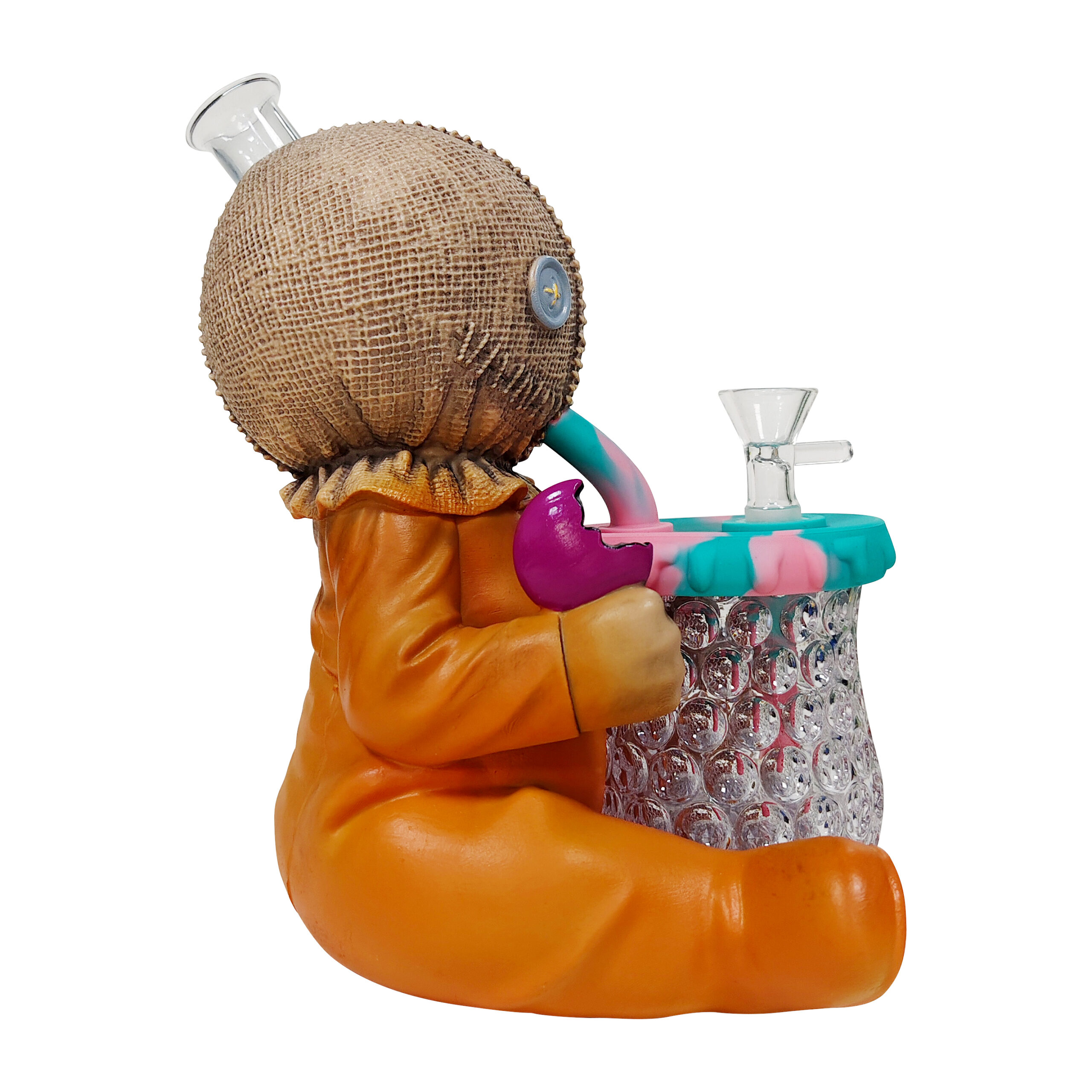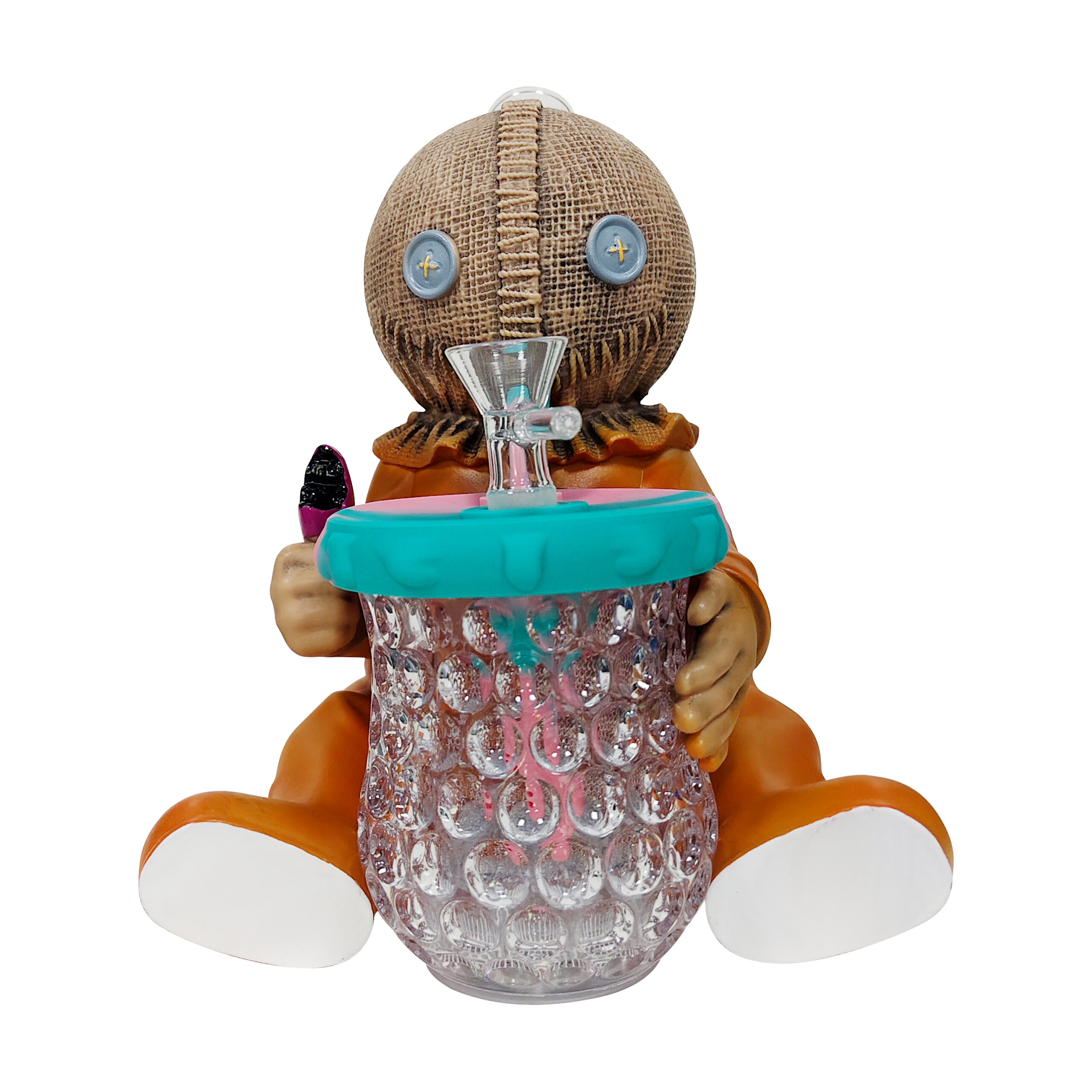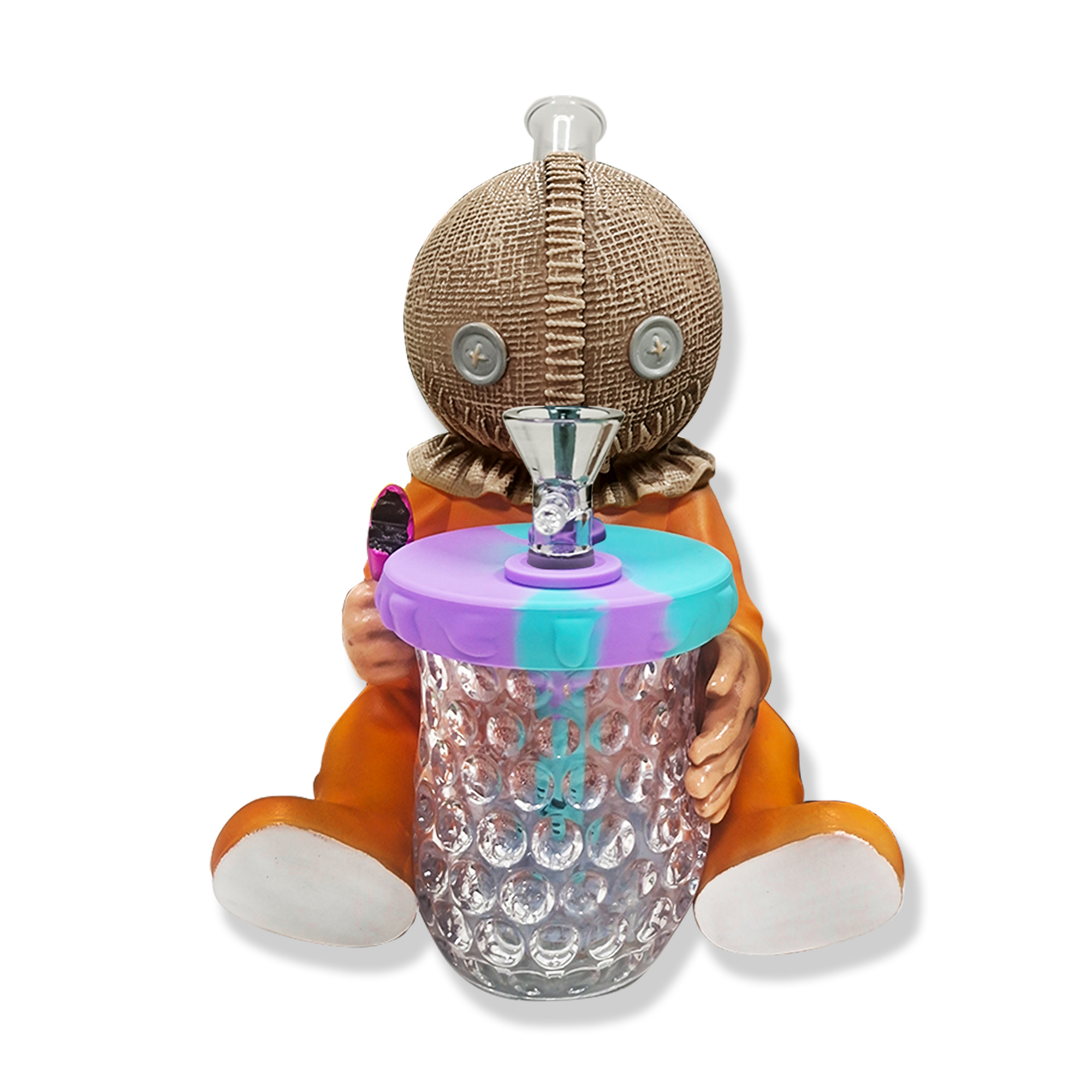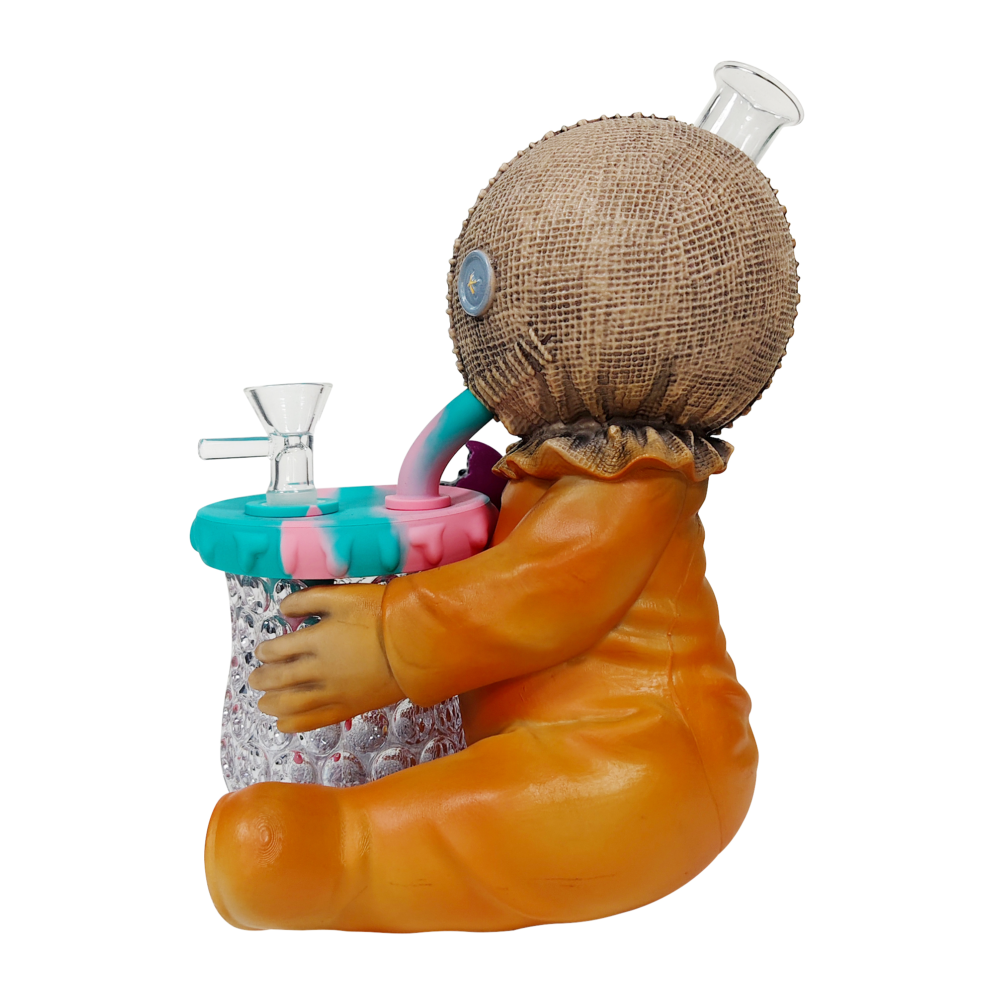 This quirky yet adorable design features a stitched burlap head and eccentric pumpkin costume. The cup held in its arms has a built-in LED lighting system. Made with a durable PVC body + high-transparency glass components for sturdiness and longevity, it comes equipped with a high-performance glass filter pot to ensure optimized filtration and smoking experience.