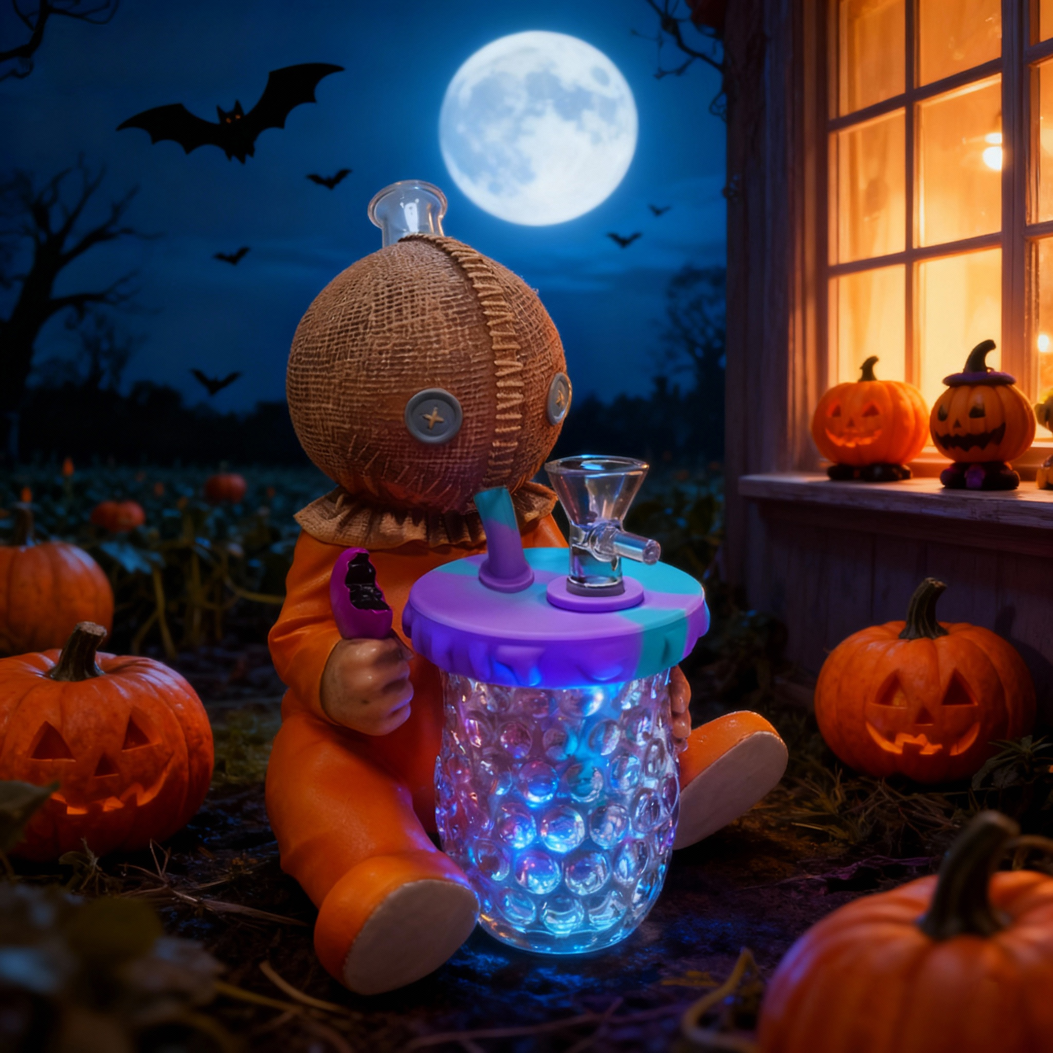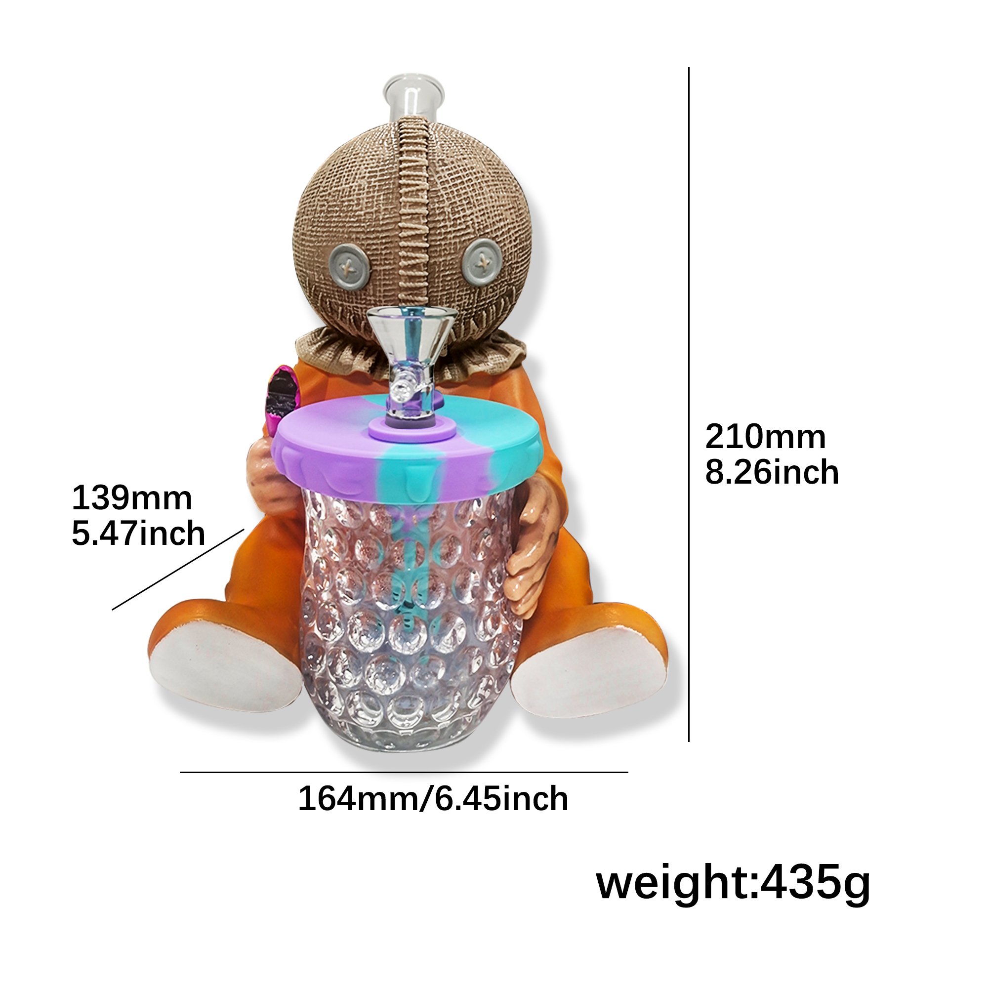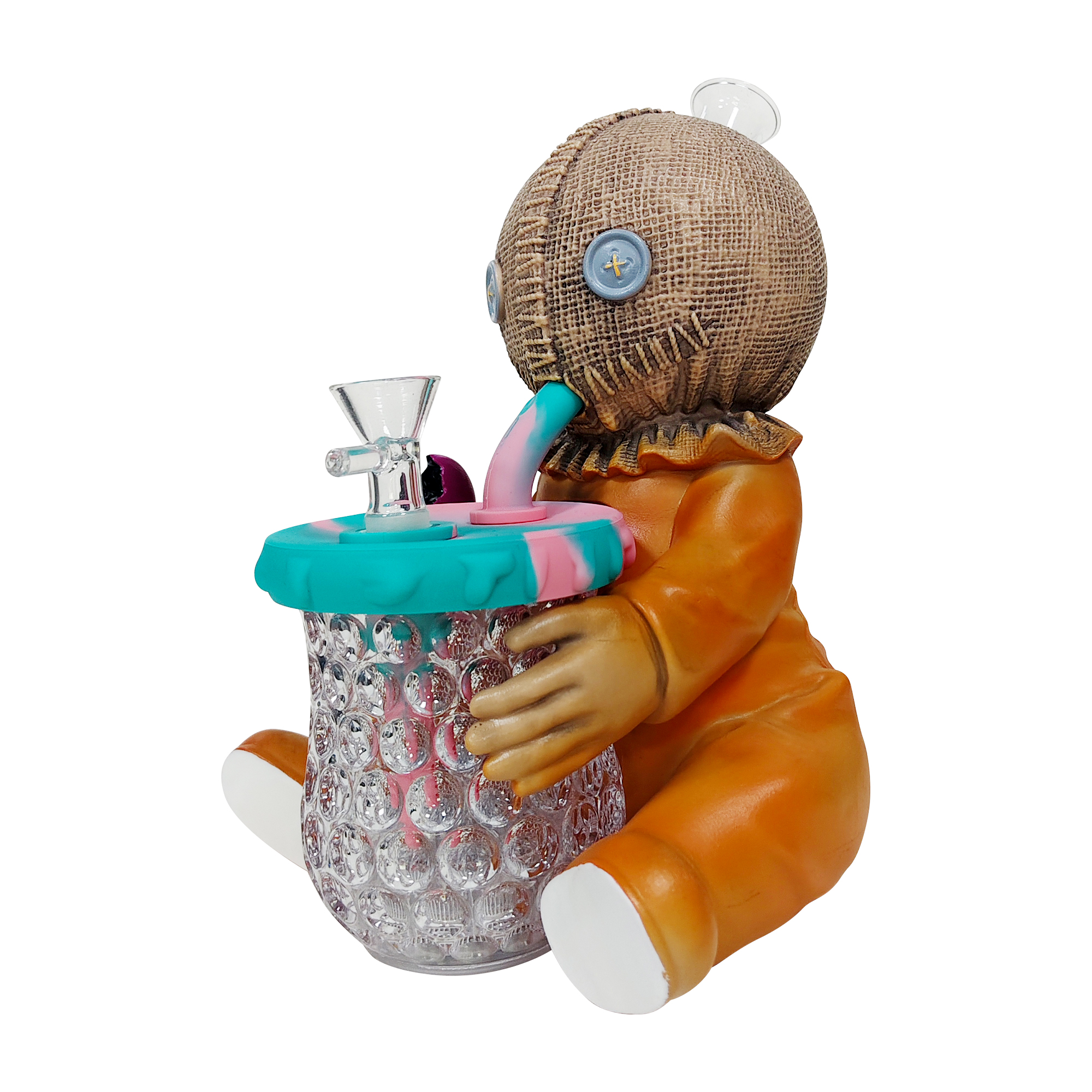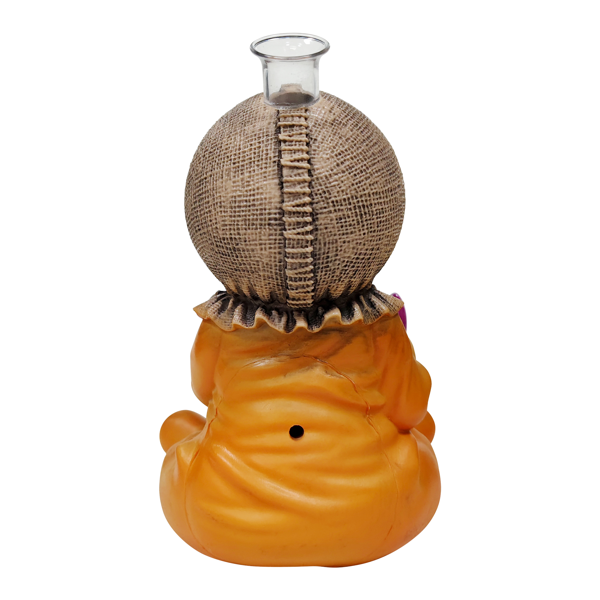 This quirky yet adorable design features a stitched burlap head and eccentric pumpkin costume. The cup held in its arms has a built-in LED lighting system. Made with a durable PVC body + high-transparency glass components for sturdiness and longevity, it comes equipped with a high-performance glass filter pot to ensure optimized filtration and smoking experience.