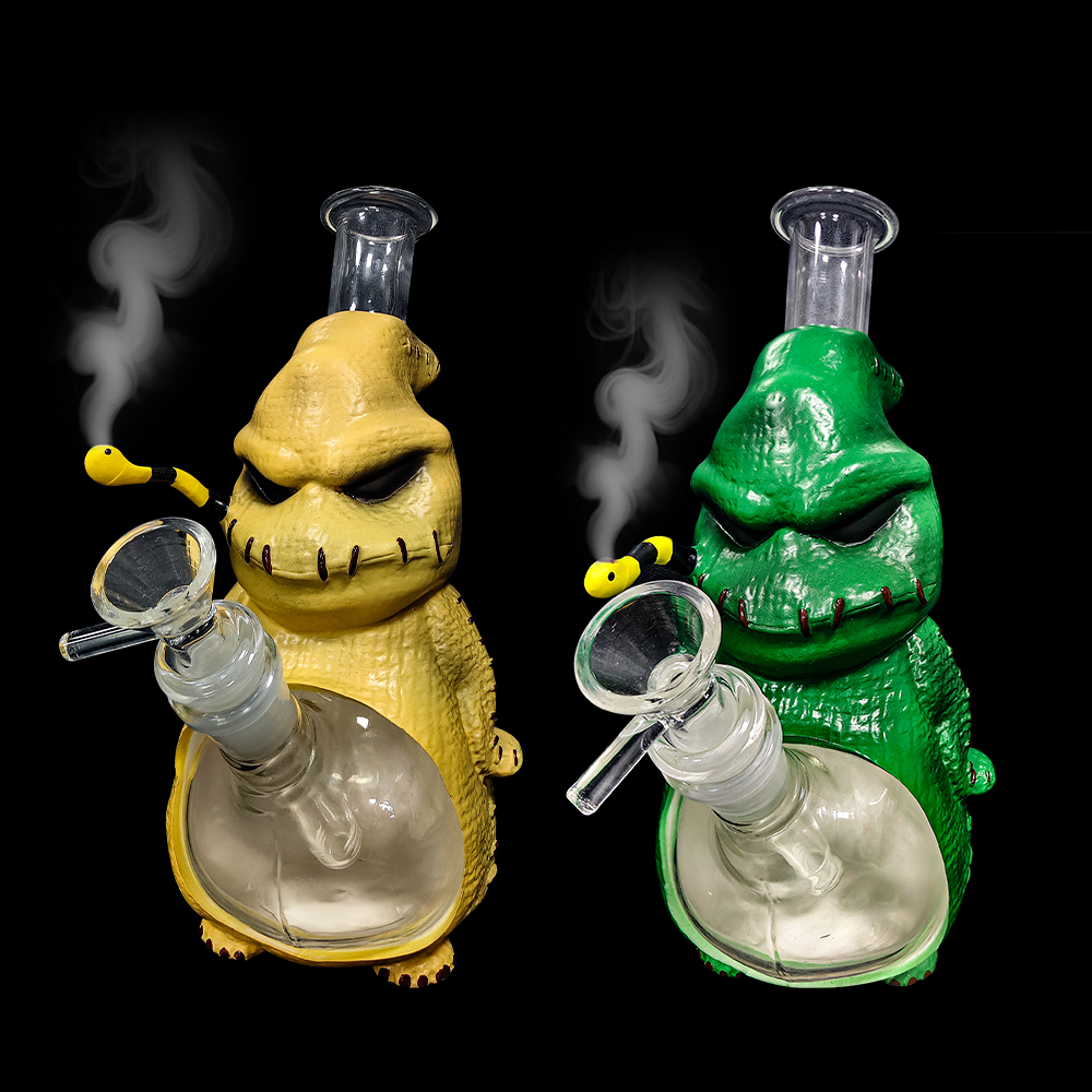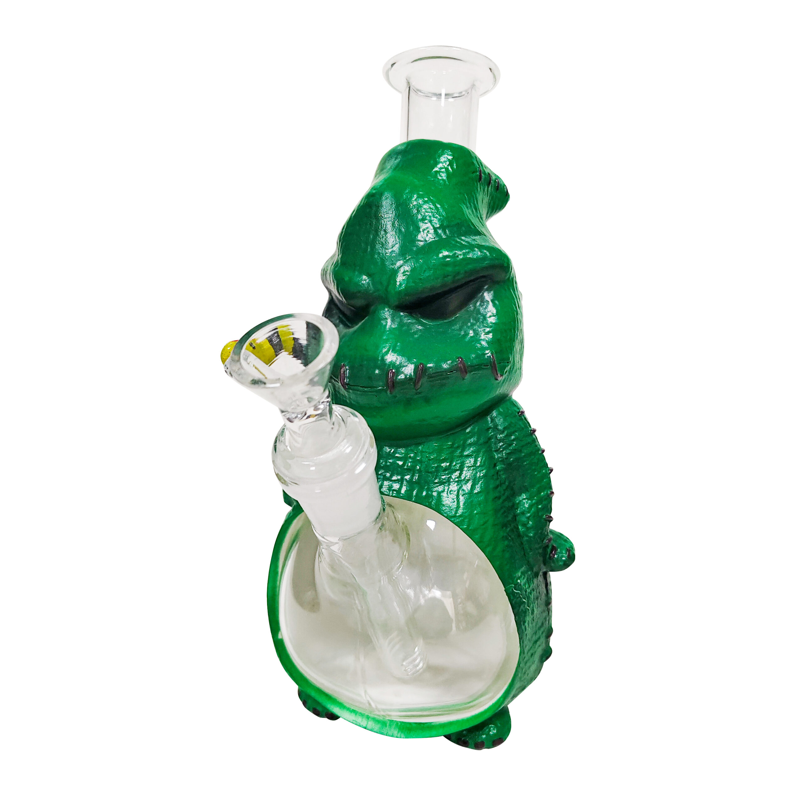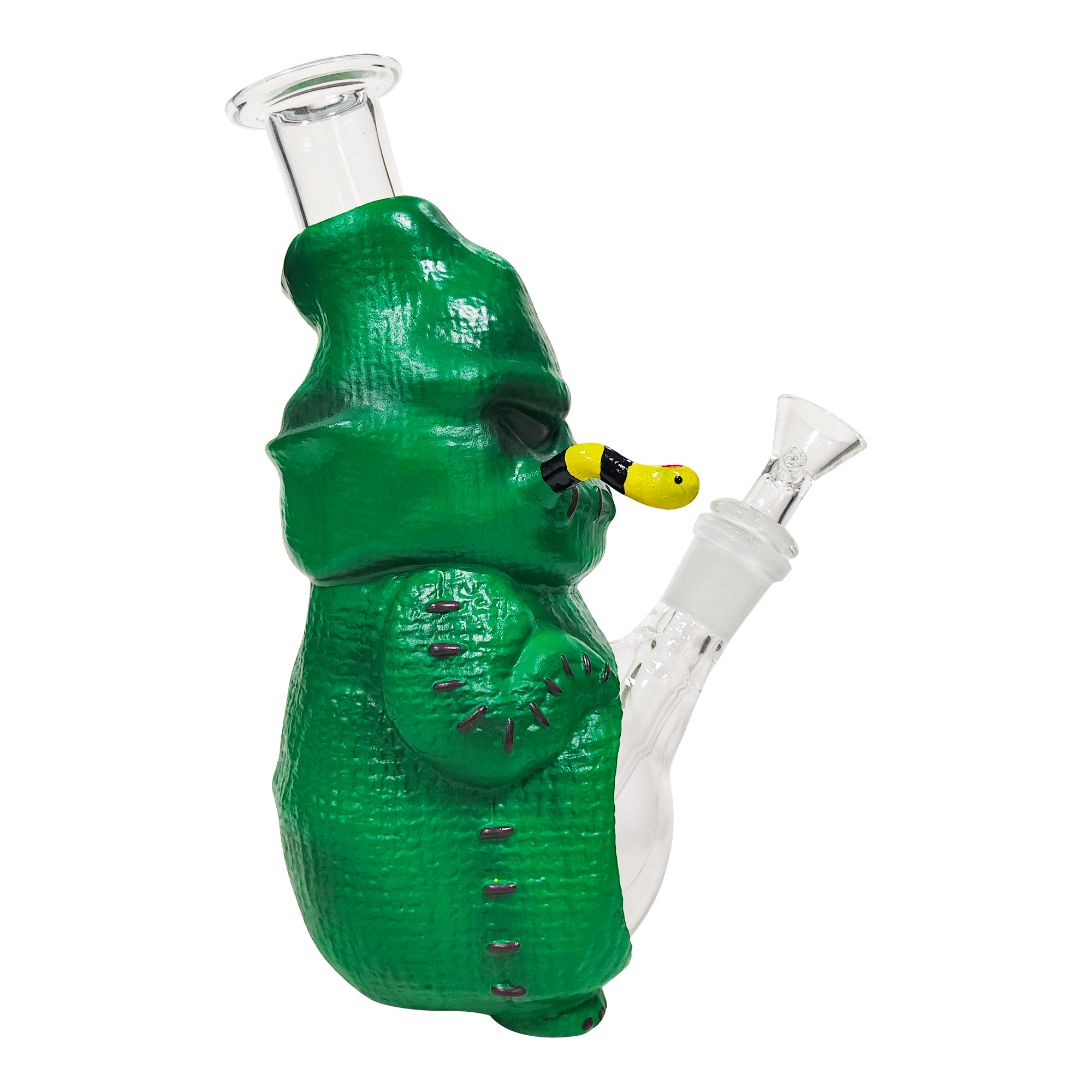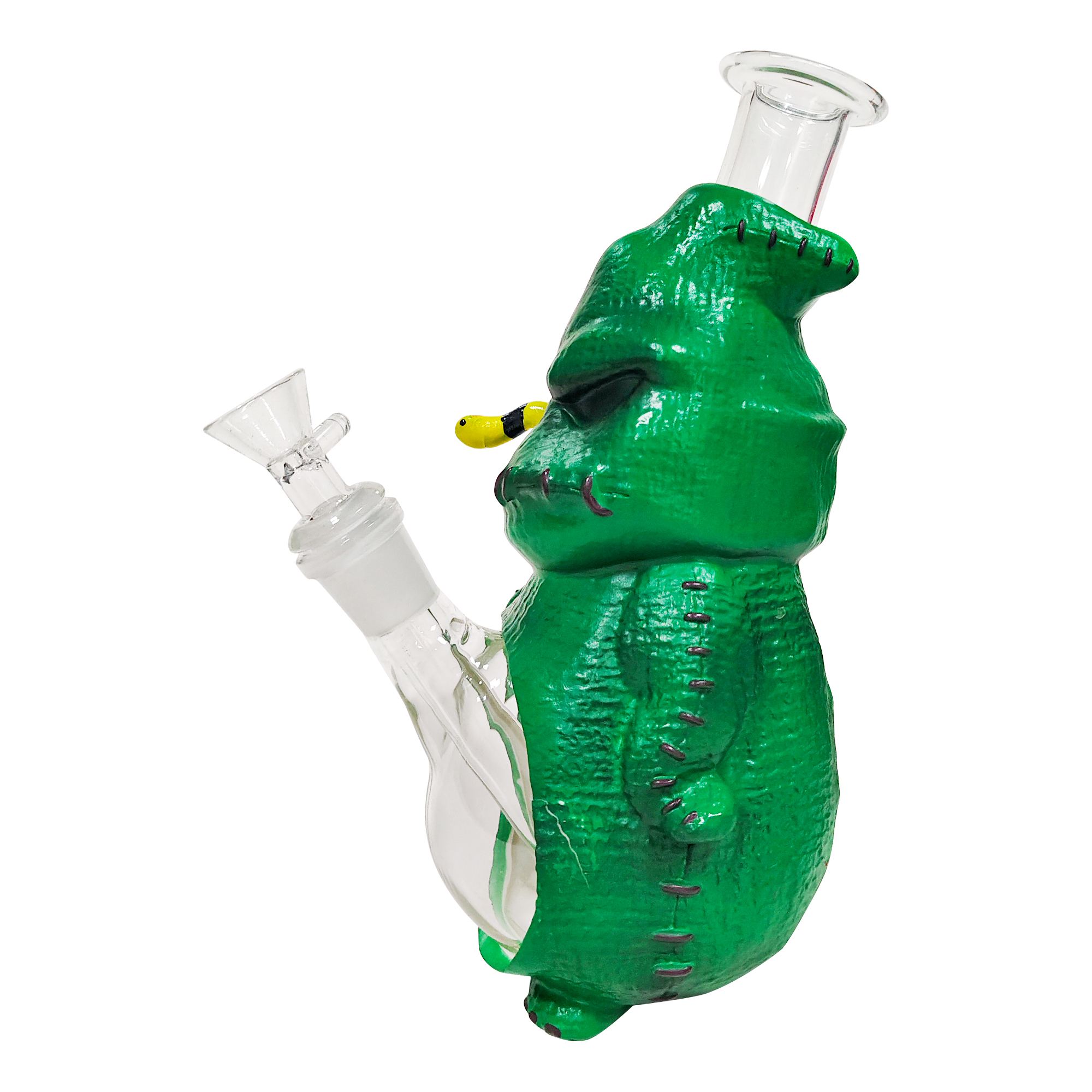 This is a doll with visible woven texture on the surface, its body parts stitched together with thick threads and exposed seams. It has a round, chubby, and stocky figure with relatively short limbs (arms and legs), giving an overall clumsy yet eerie appearance. The eyes are deep black hollows (paired with fierce-looking eyebrows), and the mouth is a grinning row of stitched seams; it often holds a yellow pipe with black patterns in its mouth. Made with durable PVC body + high-transparency glass components, combined with sturdy glass to ensure smooth smoking. Whether for sci-fi enthusiasts or pipe collectors, this smoking pipe is an indispensable must-have!